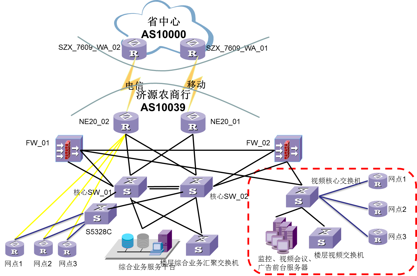 1、扁平化网络结构,视频业务和营帐业务流量分离;